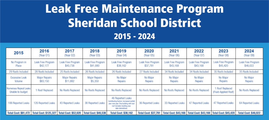 During these first three years, leaks fell from 188 to just 38, and the district replaced only one roof — a strong indicator that existing systems could be preserved rather than replaced outright.